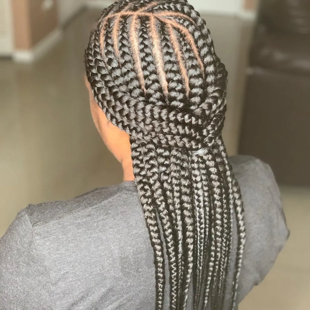 The symmetry and tightness make the style look both sleek and long-lasting. The braids fall freely down the back, allowing for simple versatility in styling. It’s an ideal protective look for those who want neat, polished braids with a creative twist.
