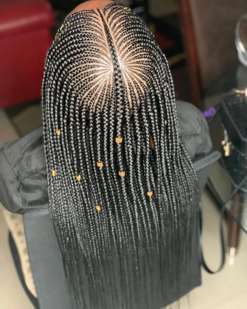 Each braid is slim and precise, allowing for flexibility in how they’re styled later.The center-parted design keeps everything symmetrical and balanced. This protective style is perfect for those who love long-lasting braids with a unique and detailed parting pattern.