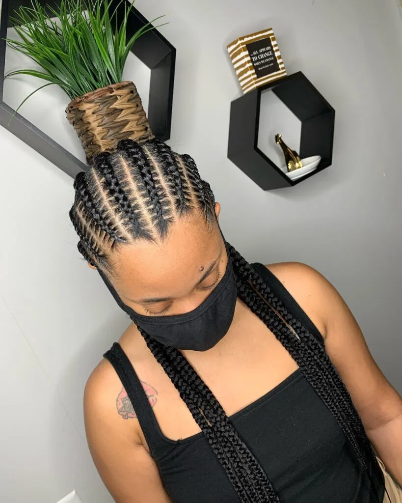 This style features large, clean feed-in cornrows that start at the scalp and extend smoothly down the back. Each braid is carefully spaced to create a visually pleasing pattern that radiates outward. The cornrows are gathered at the back and wrapped halfway into a low, knotted design.