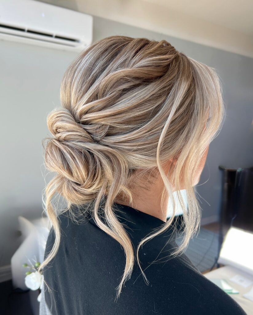 This soft twisted low bun is effortlessly elegant, making it a beautiful choice for bridesmaids. The gentle twists add dimension and texture, while the loosely gathered bun sits gracefully at the nape. Soft face-framing strands bring movement and a romantic touch that flatters every face shape.