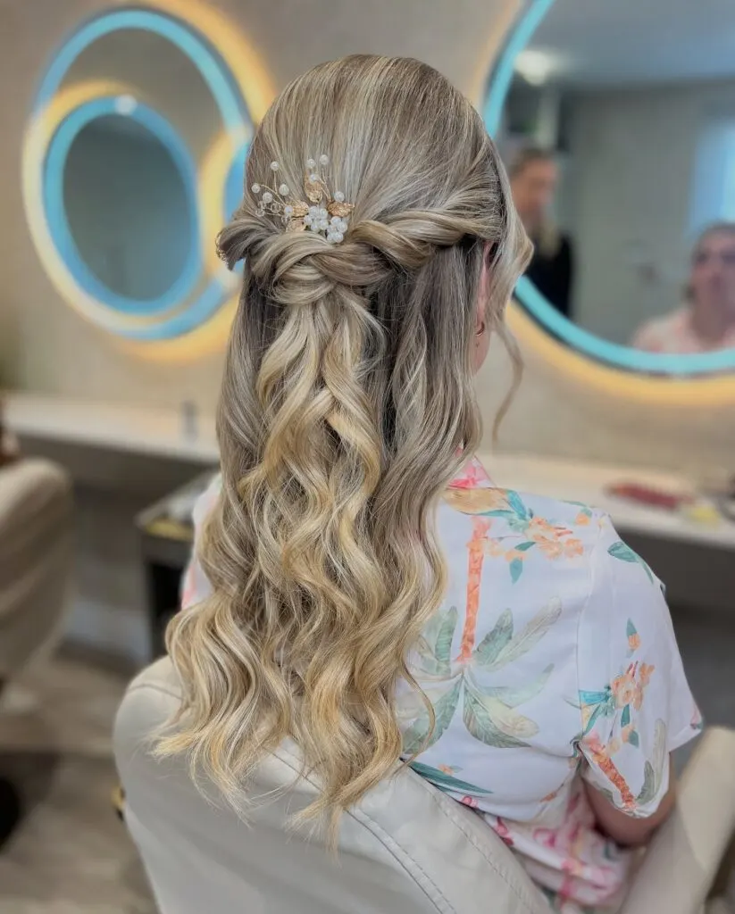 This elegant half-up hairstyle combines soft waves with delicate twists that meet at the back in a graceful finish. The pearl and gold hair accessory adds a romantic bridal touch, enhancing the overall charm. Loose, defined curls flow beautifully down the back, creating movement and texture without appearing overly styled.