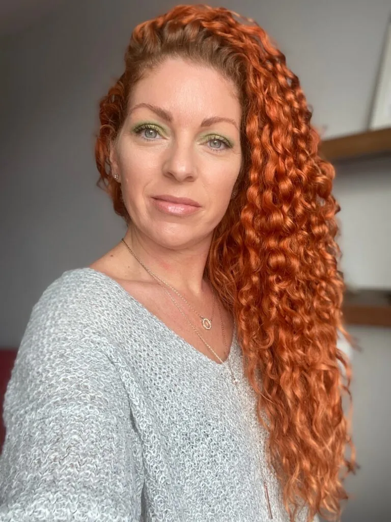 Voluminous Copper Curls with Curly Bangs
