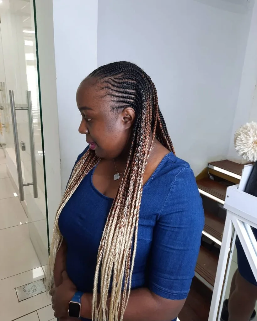 Two thinner braids at the front add softness and balance to the look. The metallic color choice makes the hairstyle stand out while still offering the protective benefits of traditional Ghana braids. It’s a confident and creative choice for modern style lovers.