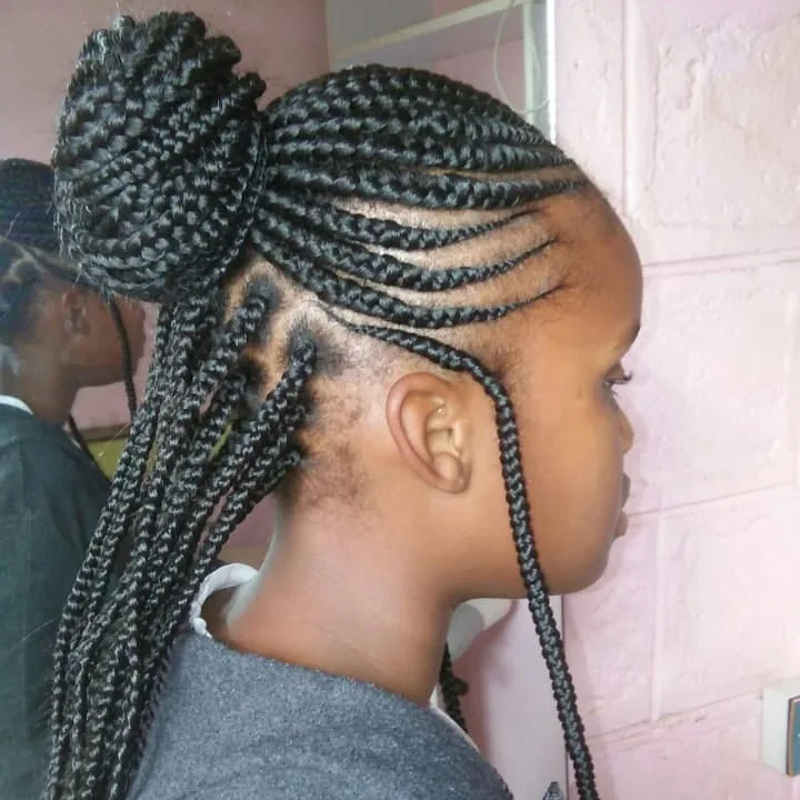 This stylish Ghana braid hairstyle features sleek, curved feed-in braids that flow toward the crown. The top section is styled into a compact braided bun, adding height and elegance. The back section is left to hang freely, creating a graceful half-up, half-down look.