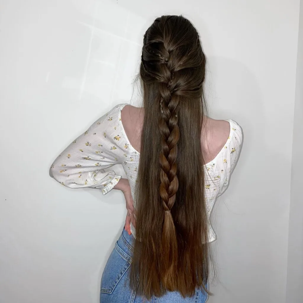 This hairstyle combines a loose half-up braid with long, straight hair flowing naturally down the back. The braid begins high at the crown, adding structure while still leaving plenty of length untouched. This mix creates balance, offering both elegance and casual charm.