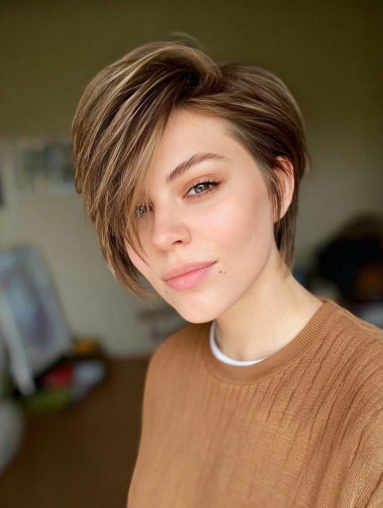 An asymmetrical long pixie gives you a more directional shape, with one side left noticeably longer for extra interest. That uneven outline adds personality without making the haircut feel too dramatic for everyday wear. The contrast also helps frame the face in a flattering way, especially when the longer side falls near the cheekbone. This style feels modern, sharp, and easy to personalize. You can wear it smooth for a cleaner look or add texture to make the shape feel more relaxed.
