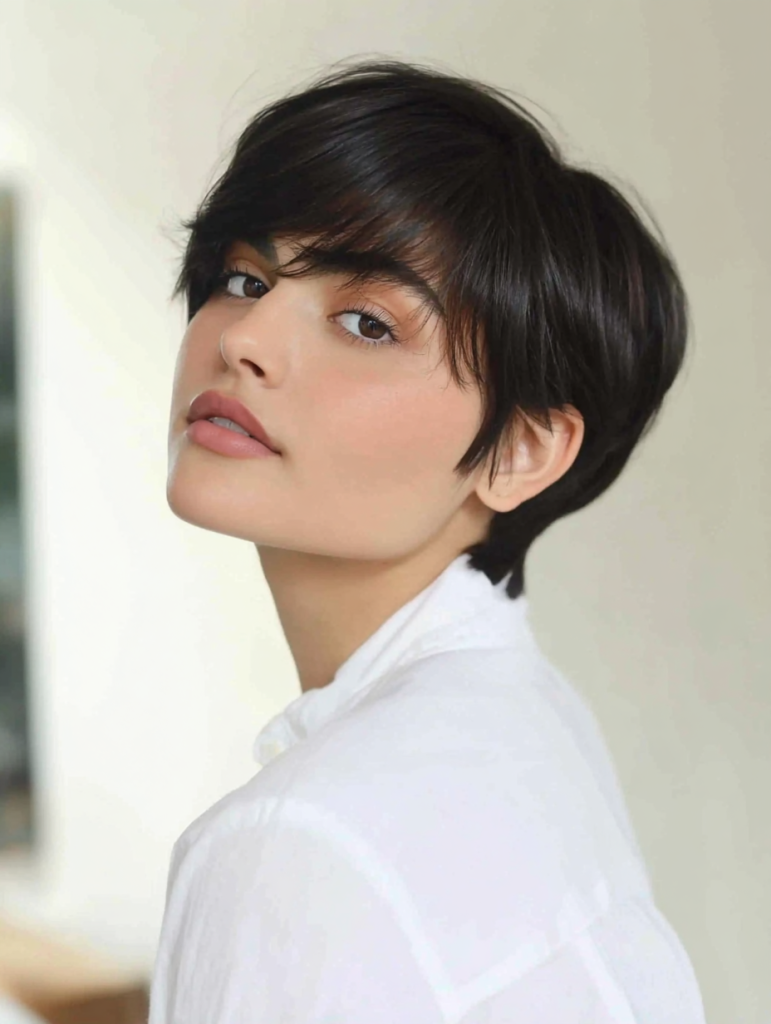 A sleek long pixie has a smooth finish that gives the haircut a polished and refined look. The longer top sections lie neatly over the crown, while the shorter back keeps the shape clean and structured. This style is a strong choice if you like hair that looks put together with very little fuss. It can feel elegant for work, evenings out, or everyday wear. A lightweight serum or smoothing cream helps keep the shape glossy and controlled.