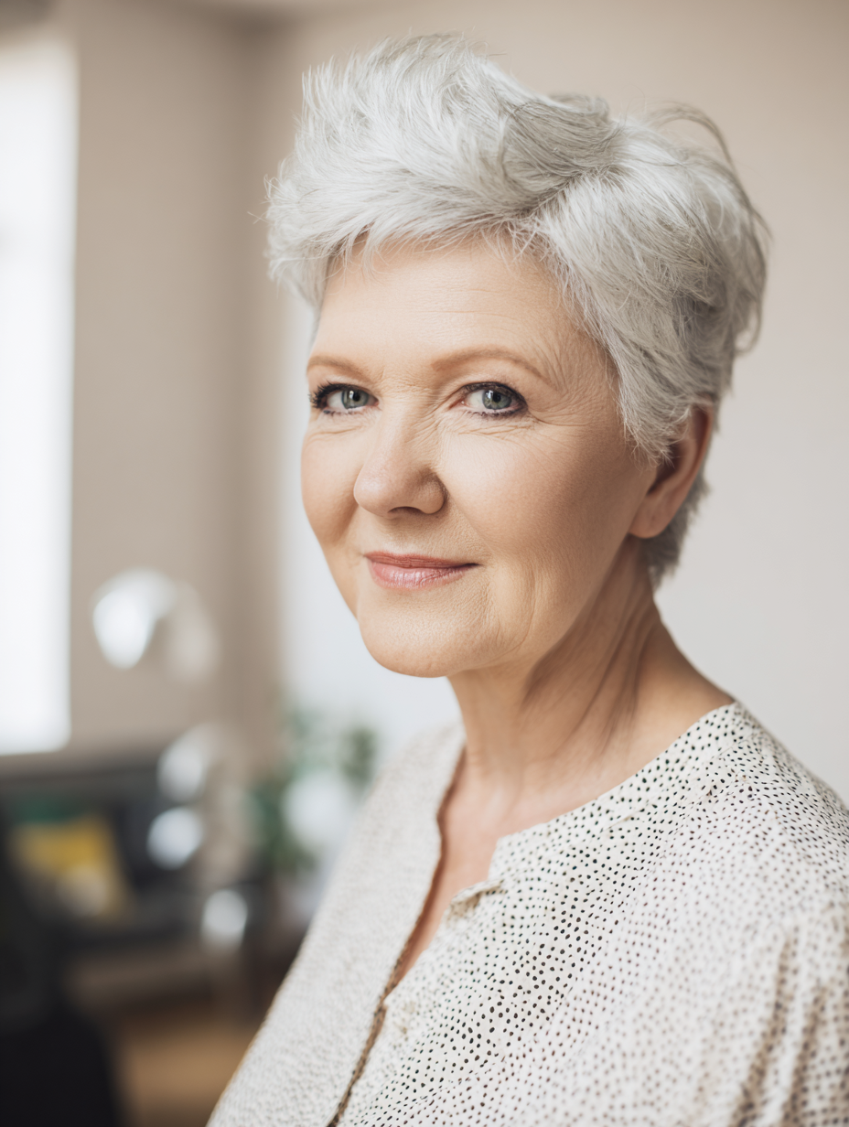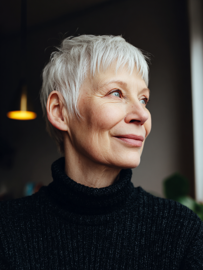 A soft layered pixie bob gives older women a polished shape without feeling stiff or overly styled.