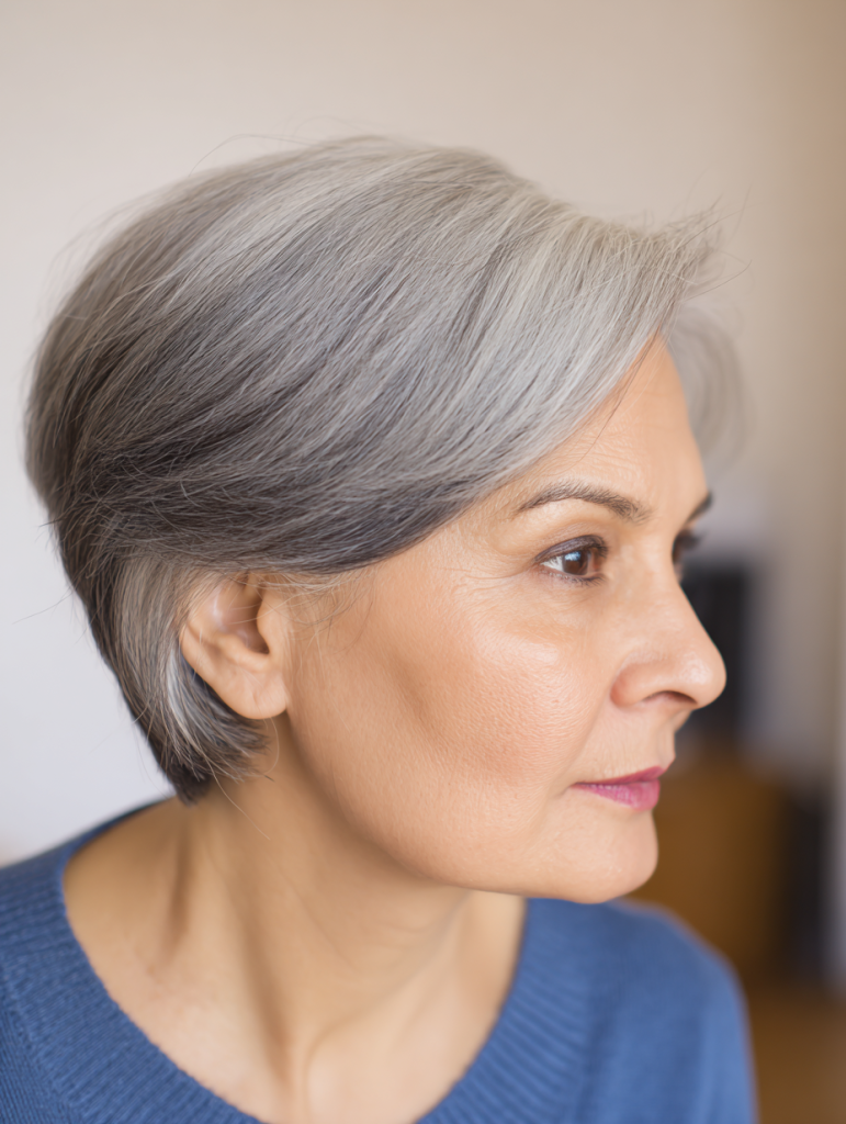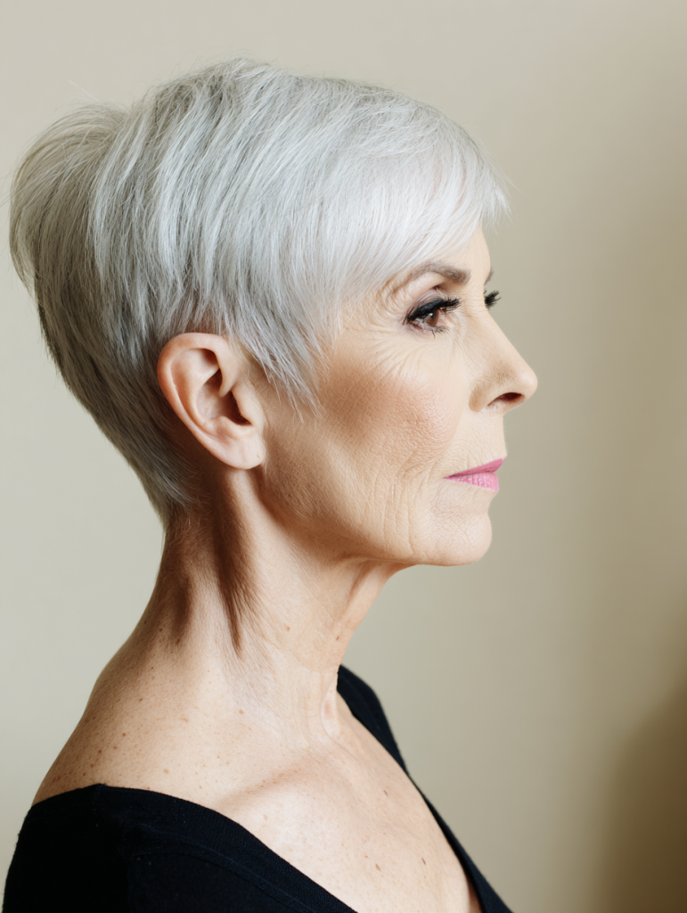 For a cleaner and more polished look, a sleek pixie bob offers smooth lines and a refined shape. The shorter back keeps the haircut manageable, while the longer front sections help frame the face in a soft, controlled way. Older women who prefer a neat finish often choose this style because it looks elegant without being complicated. It suits straight hair especially well and can make gray or silver tones look bright and intentional. A smoothing cream helps keep the finish glossy and well defined.