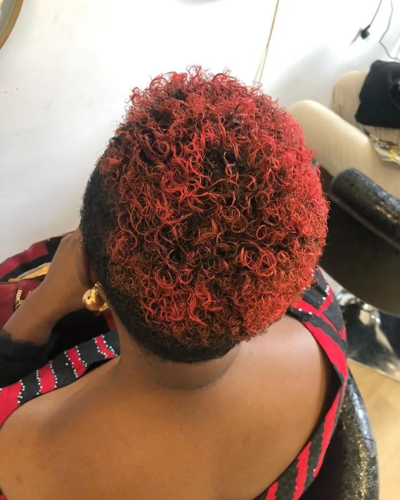This vibrant style features short, natural curls enhanced with striking red highlights concentrated at the crown. The deep black base provides a rich contrast, making the red tones stand out beautifully. The tight curls add texture and volume, creating a playful yet stylish finish.