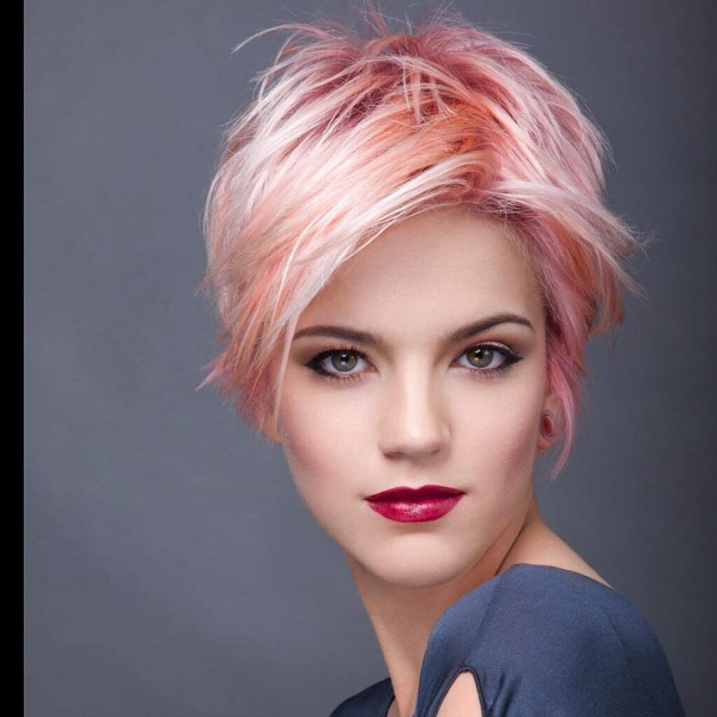 This chic pixie cut features a dreamy blend of pastel pink and soft peach tones. The textured layers add movement and volume, giving the style a playful yet sophisticated edge. Light, feathered ends frame the face beautifully, while the tousled finish keeps it effortlessly modern.