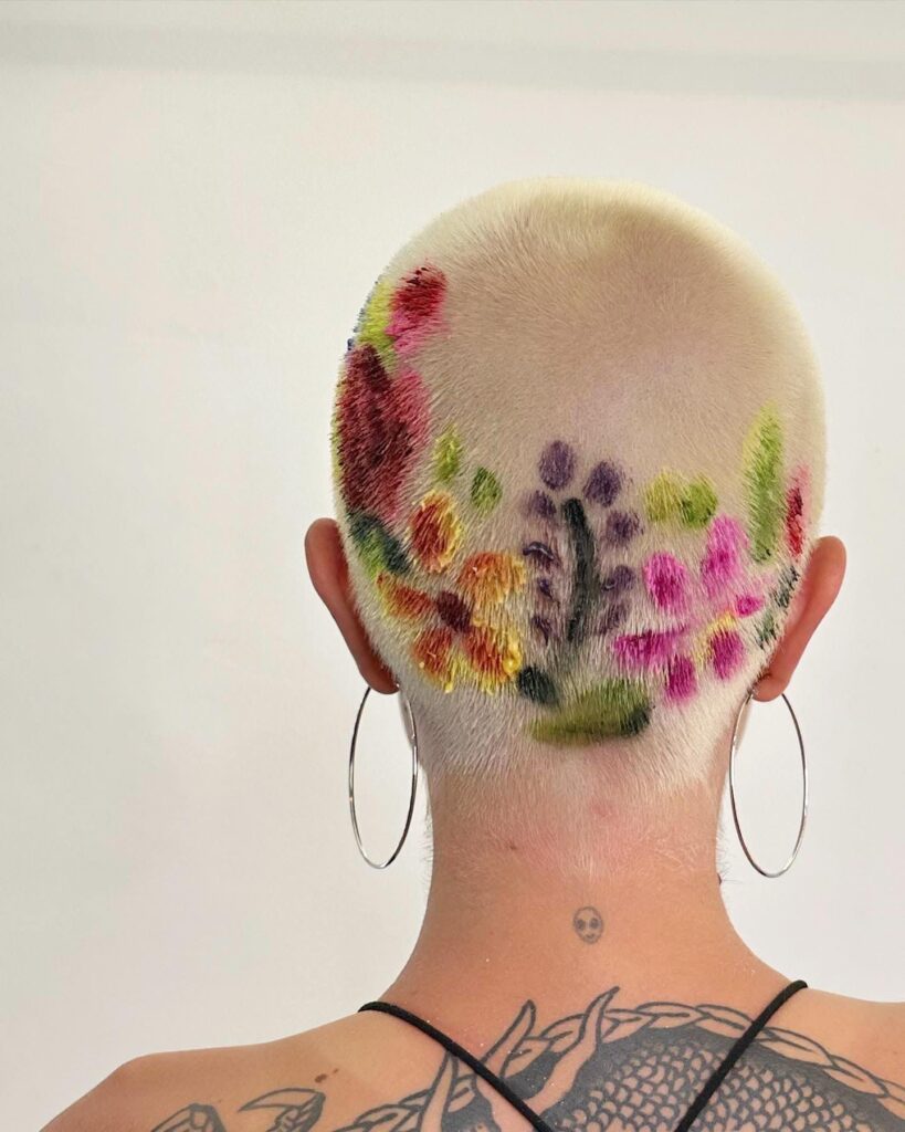 This unique buzz cut transforms hair into a vibrant artistic canvas with hand-painted floral designs. The close-cropped blonde base provides the perfect backdrop for an array of colorful blooms, including pink, yellow, red, and green accents.