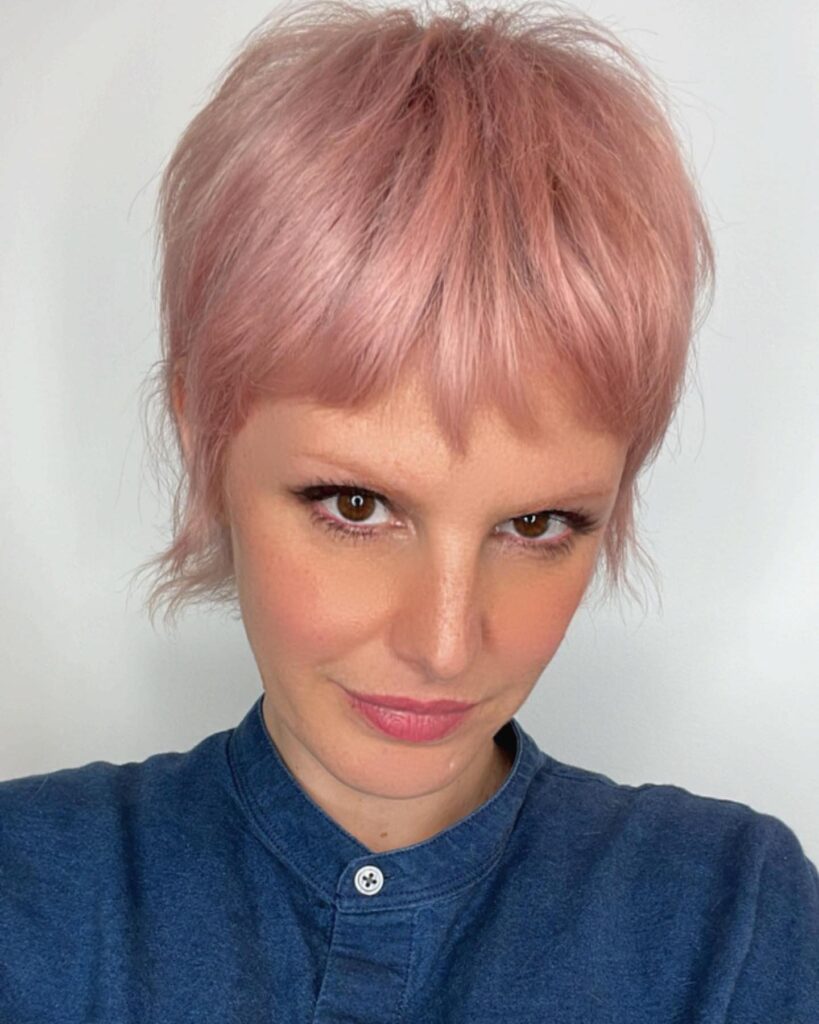 The short, piecey fringe frames the face beautifully, enhancing the overall charm of the style. Light and airy, the pastel tone complements the cut’s softness while keeping it fresh and modern. This hairstyle is ideal for those wanting a low-maintenance short cut with a touch of whimsical color.