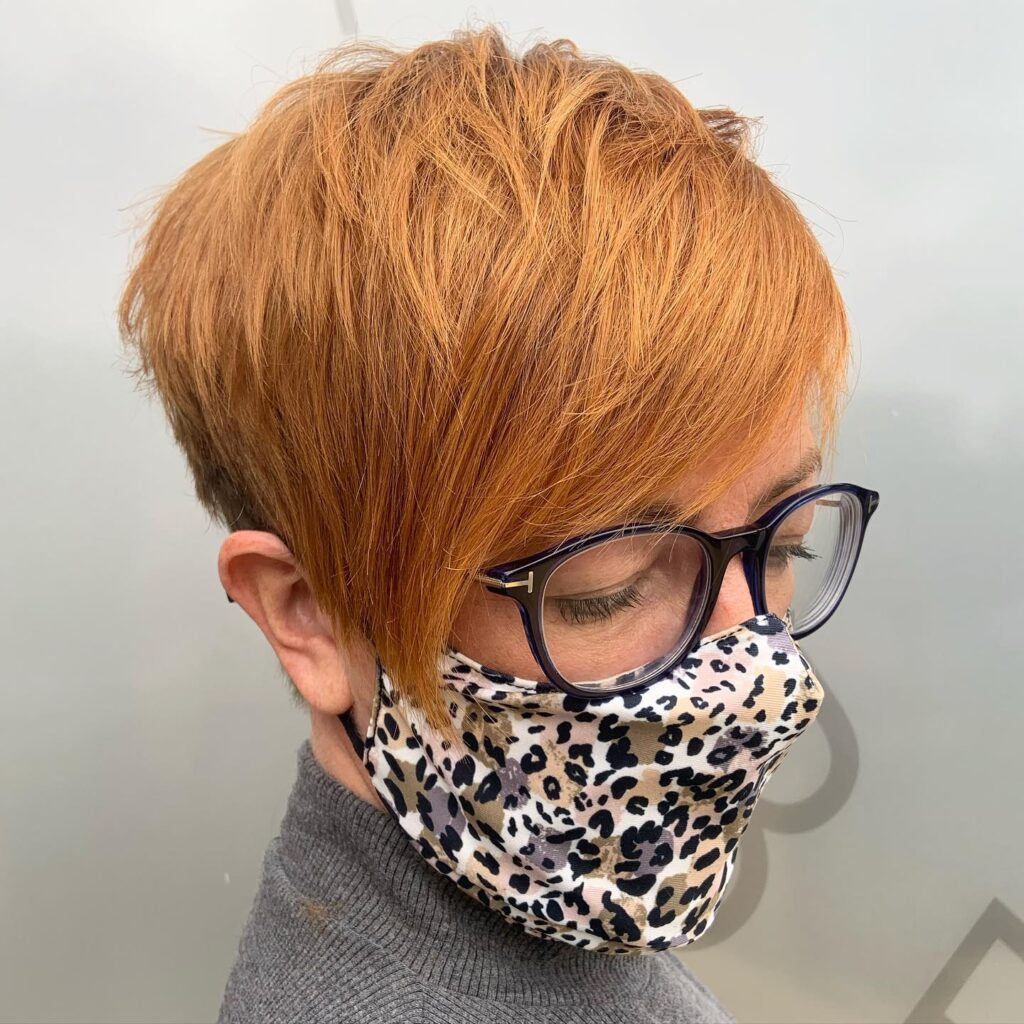 This stylish pixie cut features a rich copper hue that radiates warmth and vibrancy. The hair is expertly layered, adding volume and texture while maintaining a smooth, sleek finish. A long, side-swept fringe frames the face beautifully, softening the overall look and providing a flattering shape.