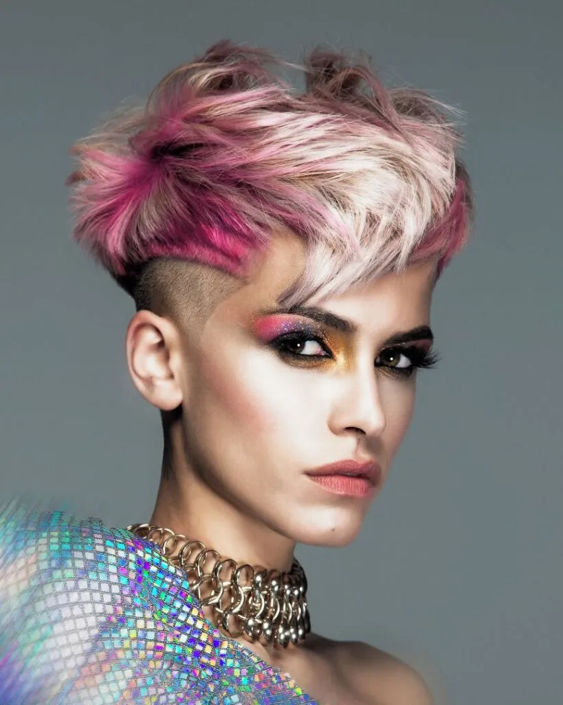 This edgy hairstyle features a bold undercut contrasted by voluminous layers on top. Platinum blonde strands dominate the crown, blending seamlessly into vibrant pink tones for a striking, modern look. The textured layers create movement and height, enhancing the hairstyle’s daring and fashion-forward appeal.