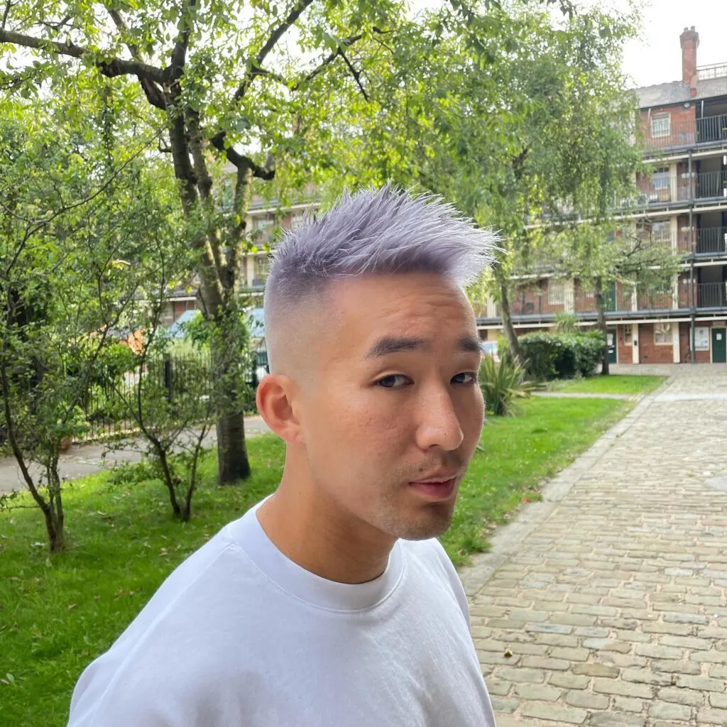 This edgy textured crop features short spiky layers on top with a precise skin fade on the sides. The haircut is sharp and modern, offering a clean finish that highlights the natural structure of the face. The icy lavender tone adds a bold, creative twist to an otherwise classic short style.