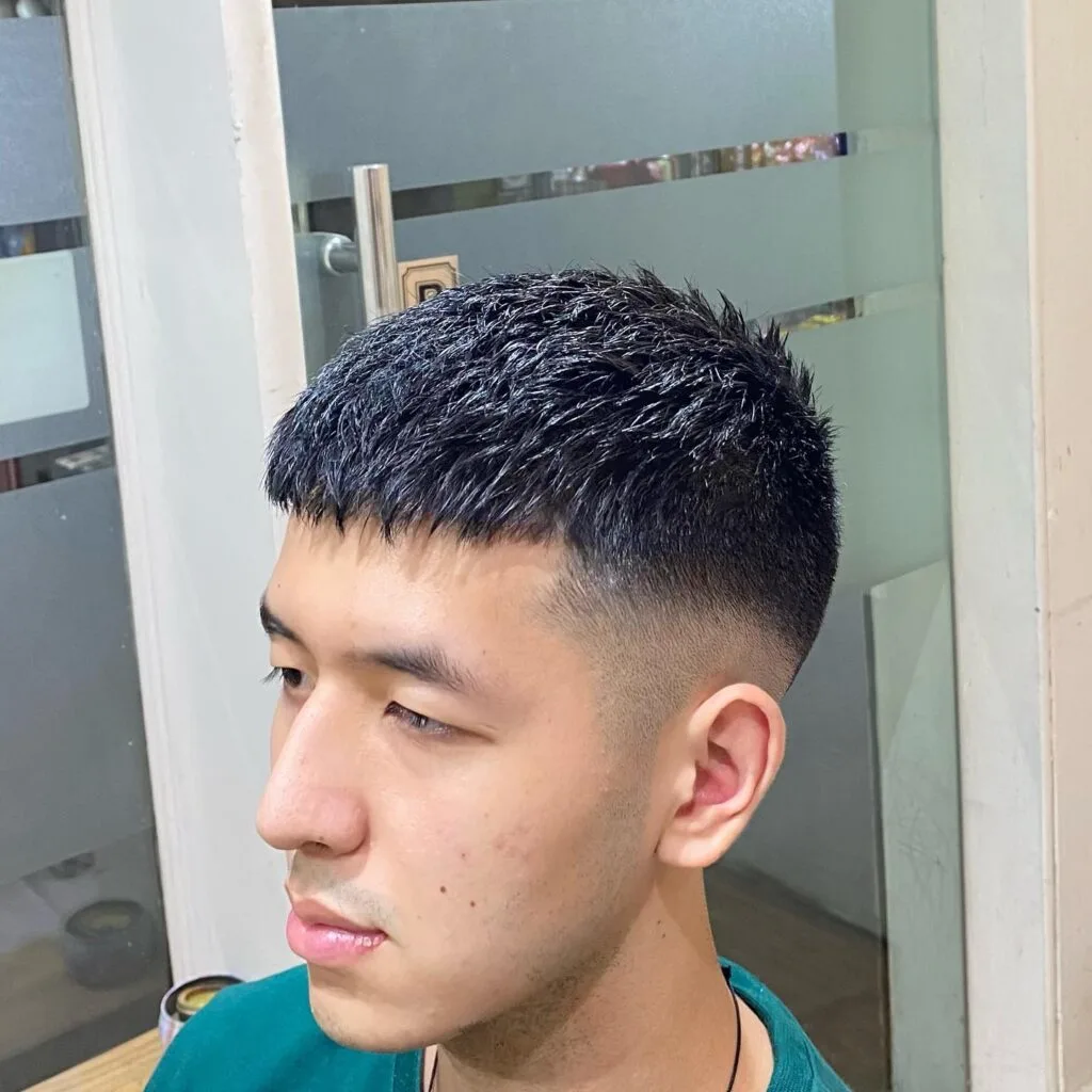 This military-style crew cut features short, neatly trimmed hair on top paired with a sharp high fade on the sides. The clean transition from the longer top to the skin-tight fade gives it a bold, structured look. This cut is ideal for men who prefer a tidy, no-nonsense style that requires minimal maintenance.