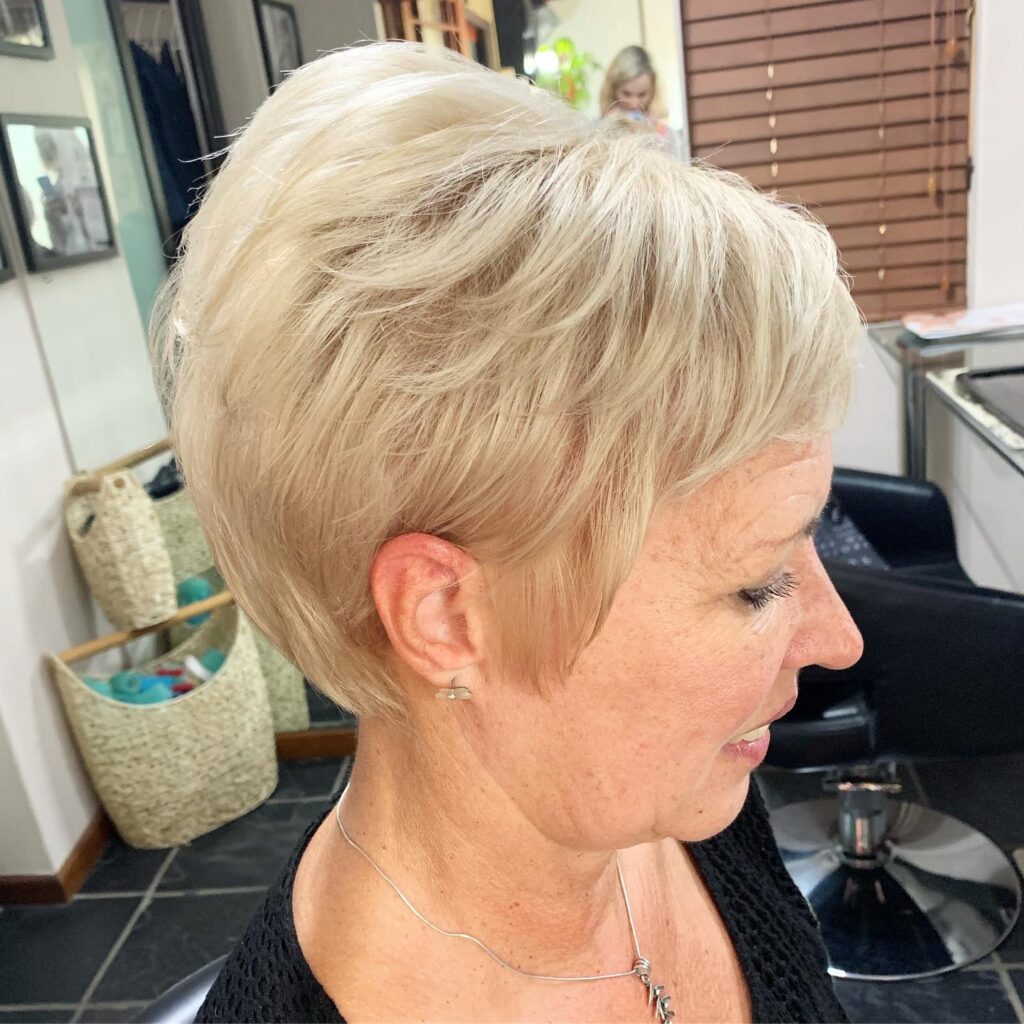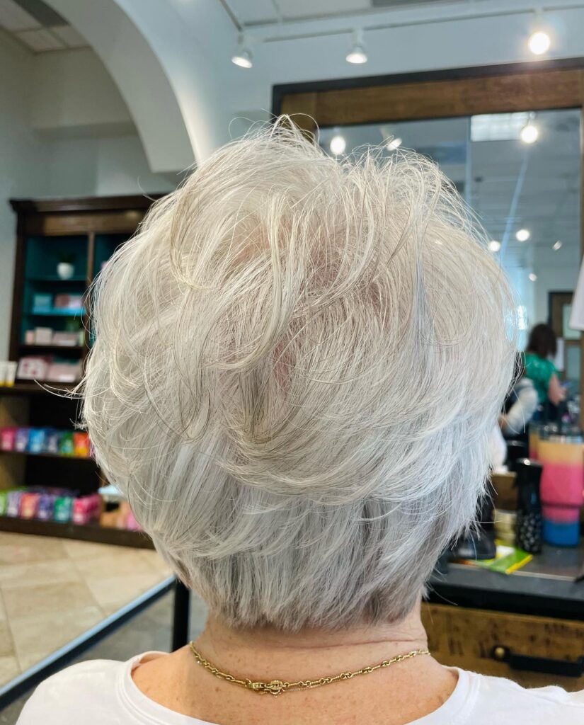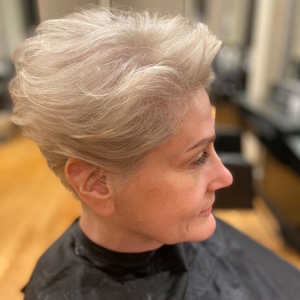 This voluminous silver pixie is styled with lifted layers that create a full and airy appearance. The strands are softly swept back, adding height and body without overwhelming thin hair. The tapered sides keep the shape neat while drawing attention upward to the textured crown.