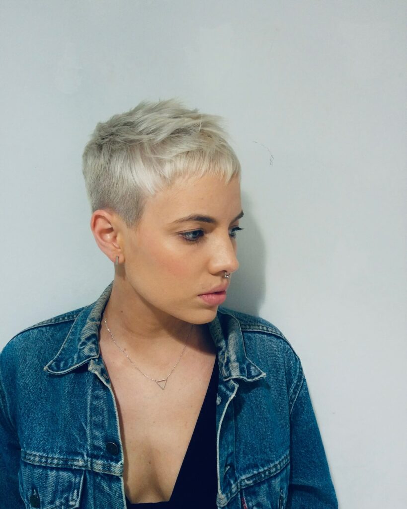 This textured platinum crop cut is ultra-short and modern, with choppy layers that give fine hair added lift and movement. The fringe is left slightly jagged, creating a playful edge that draws attention to the eyes. The sides and back are neatly tapered, making the top appear fuller and more defined.