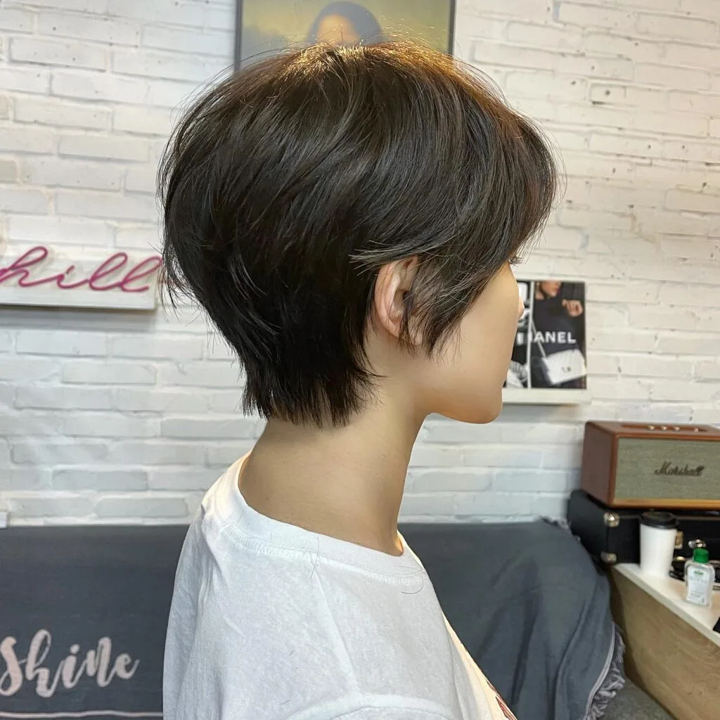 This soft layered pixie cut features subtle tapering at the nape and feathered layers that add gentle volume throughout. The rounded shape enhances the fullness of fine hair while maintaining a natural, effortless vibe.