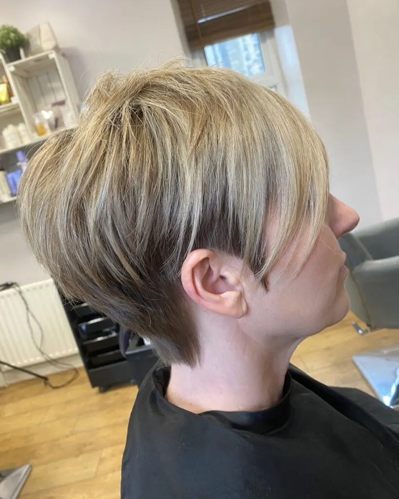 This blonde tapered pixie bob blends the structure of a pixie with the softness of a bob. Layers at the crown create volume and bounce, making it perfect for fine hair that needs lift. The sides are gently contoured to frame the face, while the back tapers smoothly to the nape for a clean finish.