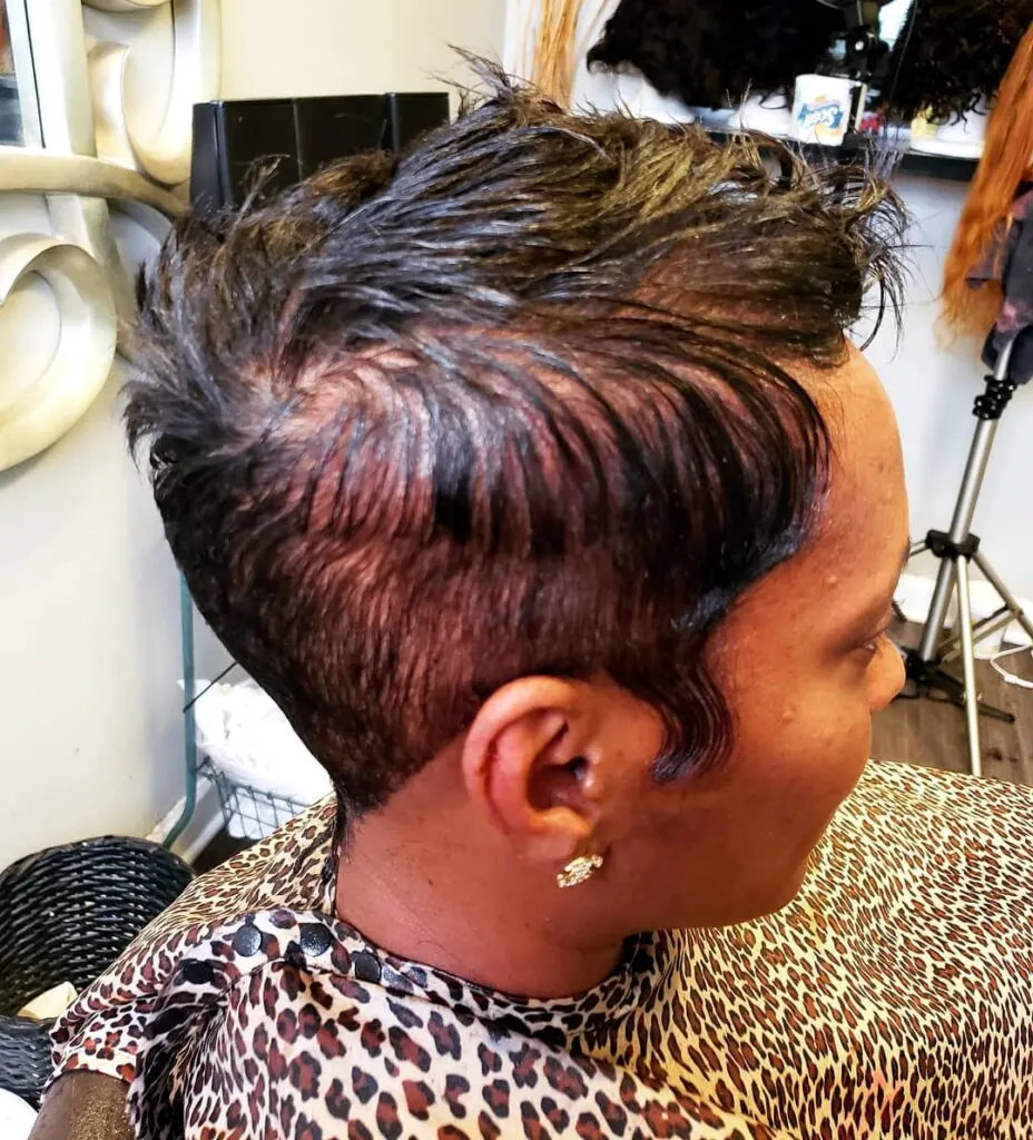 The top is styled upward and slightly back for added height and edge. This cut removes weight from the sides, allowing thin strands to appear thicker and more dynamic. It’s a fearless, fashion-forward choice for anyone wanting both lift and attitude.
