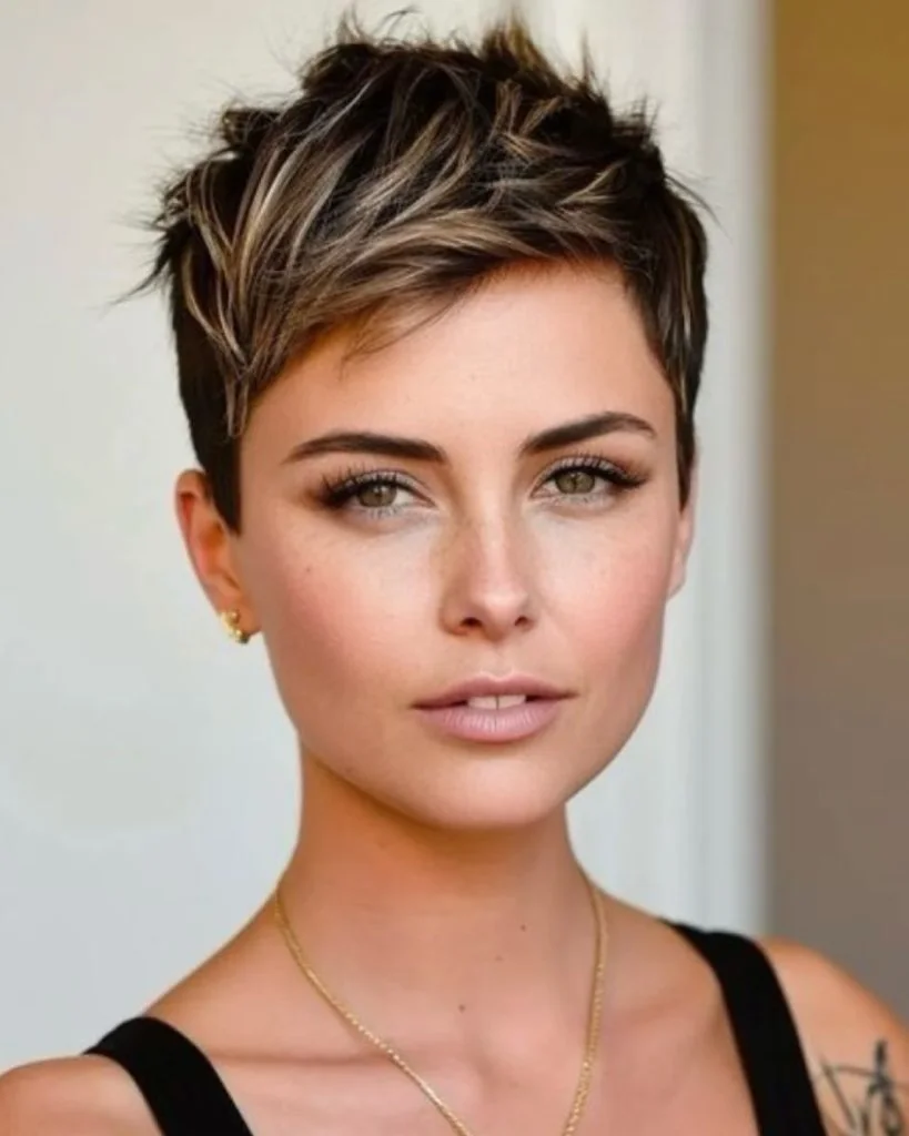 This short pixie features a dark brunette base with striking blonde highlights that add depth and contrast. The choppy layers on top create movement and texture, giving it a playful yet edgy look. The sides and back are neatly tapered for a clean finish, while the tousled top brings volume and dimension.
