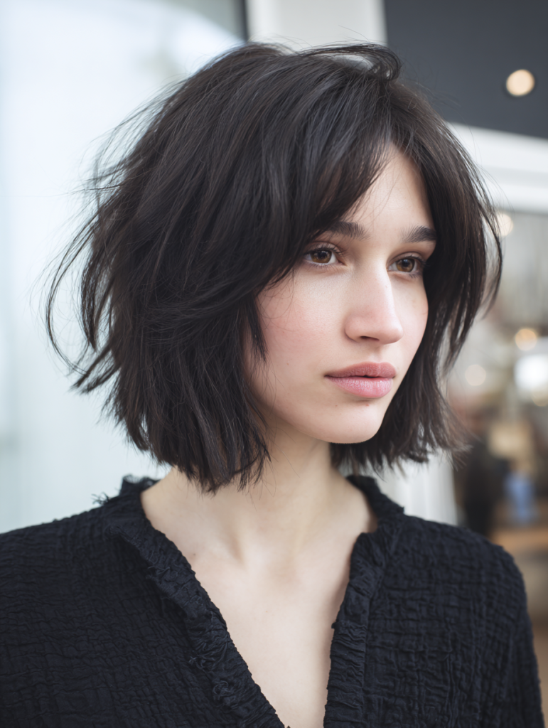 A layered French bob shag mixes polished structure with a slightly undone texture that keeps it from feeling too neat.