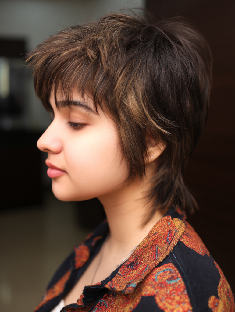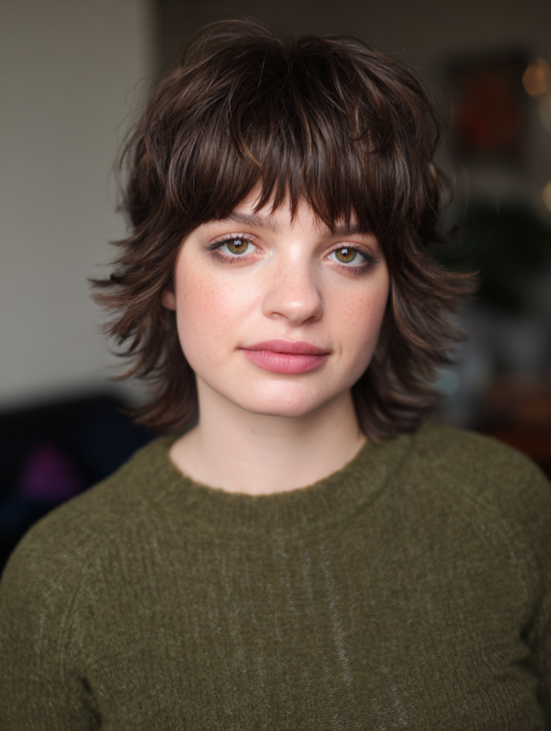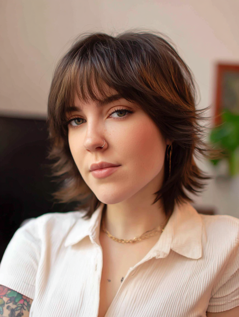 Choppy ends define this short shag and give it a slightly edgy finish without making it hard to wear. The uneven texture helps break up the shape, so the haircut feels lighter and more dynamic. This approach works well when you want to avoid blunt lines that can look heavy on short styles. The layers add dimension while keeping the overall look relaxed. With minimal styling, the choppy finish keeps its shape and gives the haircut a lived in feel.