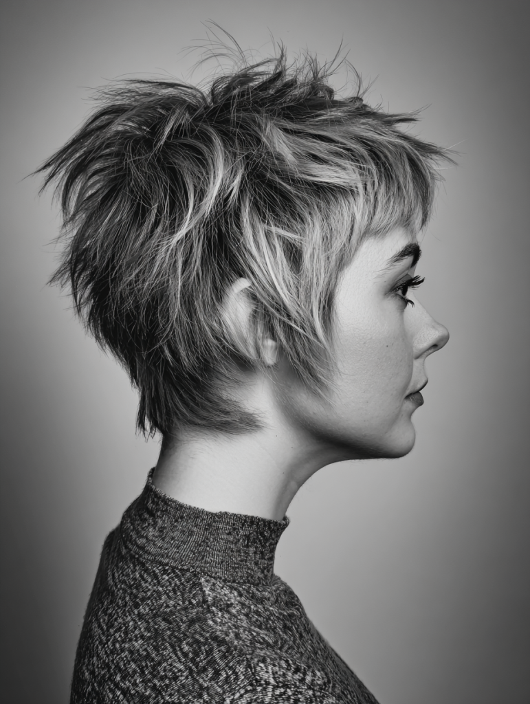 A layered shag pixie bob blends the cropped feel of a pixie with the shape of a short bob. The layers add texture throughout, giving the haircut a fuller and more dynamic appearance. This style works well if you want something short but not too close to the head. The added length around the sides and back creates balance and versatility. With a bit of styling cream or light mousse, the layers separate easily and help the haircut maintain its soft, effortless finish.