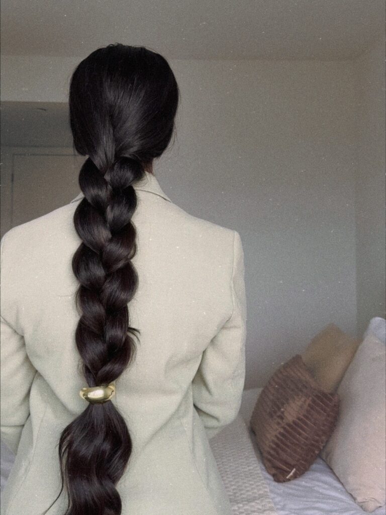 This hairstyle highlights exceptionally long hair styled into a thick, sleek braid that extends down the back. The braid starts neatly at the crown, keeping the hair polished while showing off its impressive length. A simple scrunchie secures the end, adding a soft touch without distracting from the braid’s elegance.