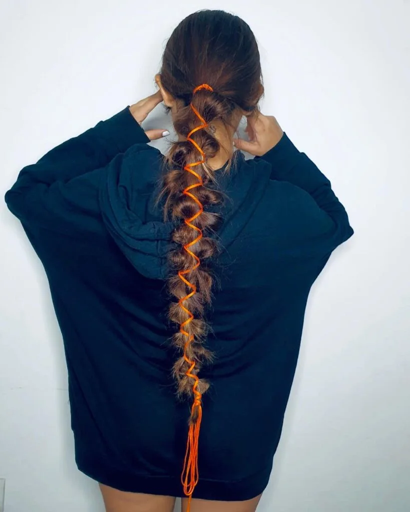 This long hairstyle features a thick braided ponytail secured with a bright orange wrap spiraling downward. The vivid string adds contrast, making the braid look structured while enhancing its natural volume.